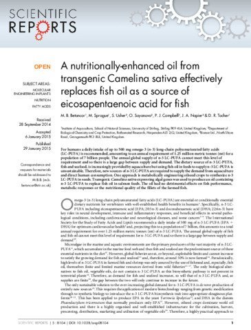 A nutritionally-enhanced oil from transgenic Camelina sativa effectively replaces fish oil as a source of eicosapentaenoic acid for fish.