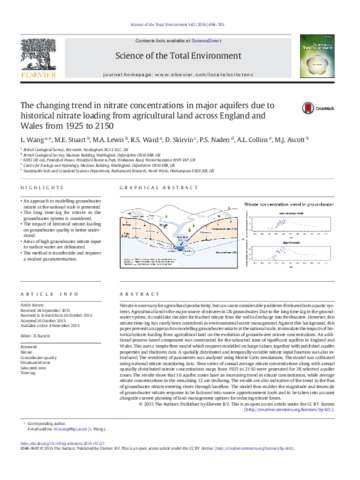 The changing trend in nitrate concentrations in major aquifers due to historical nitrate loading from agricultural land across England and Wales from 1925 to 2150.