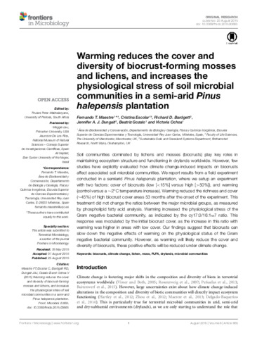 Warming reduces the cover and diversity of biocrust-forming mosses and lichens, and increases the physiological stress of soil microbial communities in a semi-arid Pinus halepensis plantation.