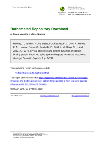 Crystal structures and binding dynamics of odorant-binding protein 3 from two aphid species Megoura viciae and Nasonovia ribisnigri