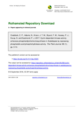 | Keywords | Arabidopsis thaliana, phosphatidylcholine, phospholipid biosynthesis, membrane biogenesis, phosphatidic acid phosphohydrolase, phosphorylation, cell cycle, cyclin-dependent kinase |