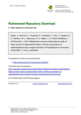 Metabolome analysis reveals betaine lipids as major source for triglyceride formation, and the accumulation of sedoheptulose during nitrogen-starvation of Phaeodactylum tricornutum