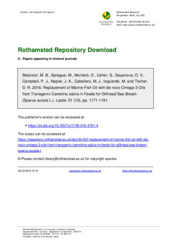 Replacement of Marine Fish Oil with de novo Omega-3 Oils from Transgenic Camelina sativa in Feeds for Gilthead Sea Bream (Sparus aurata L.).