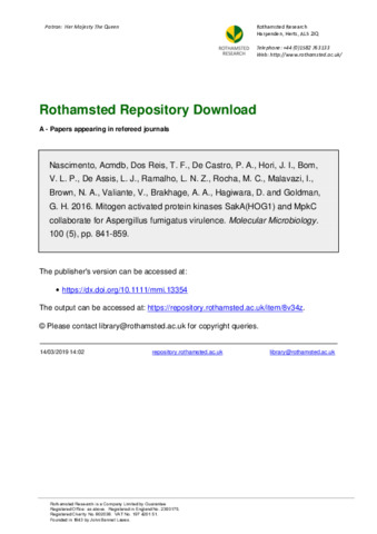 | Additional information | No Pink Form [de Oliveira Bruder Nascimento, Ariane Cristina Mendes; dos Reis, Thaila Fernanda; de Castro, Patricia Alves; Hori, Juliana I.; Pedro Bom, Vinicius Leite; de Assis, Leandro Jose; Goldman, Gustavo H.] Univ Sao Paulo, Fac Ciencias Farmaceut Ribeirao Preto, Ribeirao Preto, Brazil; [Zambelli Ramalho, Leandra Naira] Univ Sao Paulo, Fac Med Ribeirao Preto, Ribeirao Preto, Brazil; [Rocha, Marina Campos; Malavazi, Iran] Univ Fed Sao Carlos, Ctr Ciencias Biol & Saude, Dept Genet & Evolucao, Sao Carlos, SP, Brazil; [Brown, Neil Andrew] Rothamsted Res, Plant Sci & Crop Biol, Harpenden, Herts, England; [Valiante, Vito] Leibniz Inst Nat Prod Res & Infect Biol, Hans Knoll Inst, Leibniz Jr Res Grp Biobricks Microbial Nat Prod S, Jena, Germany; [Brakhage, Axel A.] Leibniz Inst Nat Prod Res & Infect Biol HKI, Dept Mol & Appl Microbiol, Jena, Germany; [Brakhage, Axel A.] Univ Jena, Inst Microbiol, Jena, Germany; [Hagiwara, Daisuke] Chiba Univ, Med Mycol Res Ctr, Chiba, Japan |