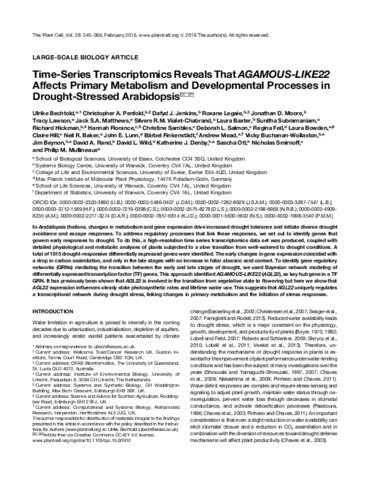 Time-Series Transcriptomics Reveals That AGAMOUS-LIKE22 Affects Primary Metabolism and Developmental Processes in Drought-Stressed Arabidopsis.