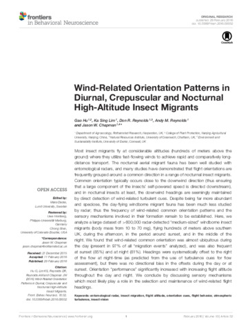 Wind-related orientation patterns in diurnal, crepuscular and nocturnal high-altitude insect migrants.