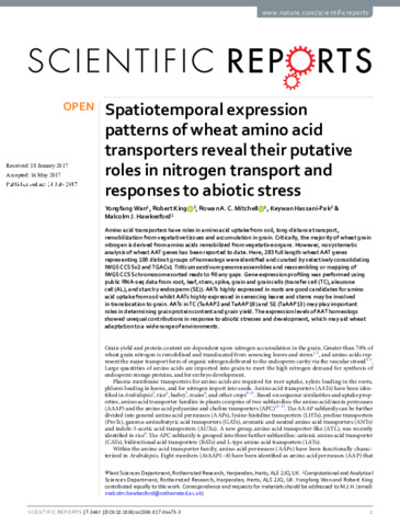 Spatiotemporal expression patterns of wheat amino acid transporters reveal their putative roles in nitrogen transport and responses to abiotic stress