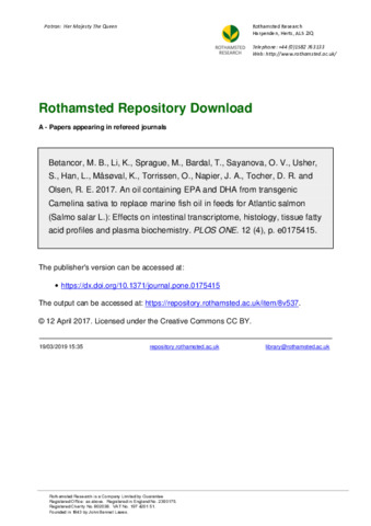 An oil containing EPA and DHA from transgenic Camelina sativa to replace marine fish oil in feeds for Atlantic salmon (Salmo salar L.): Effects on intestinal transcriptome, histology, tissue fatty acid profiles and plasma biochemistry