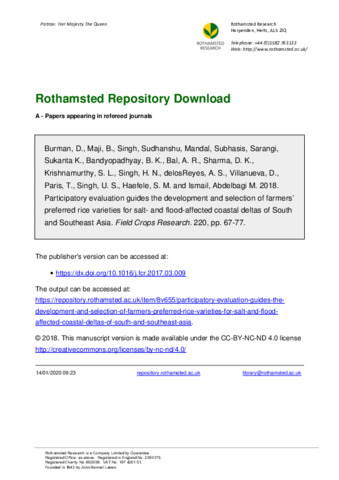 | Keywords | Farmers’ preference, Participatory varietal selection, Salinity tolerance, Sundarbans, Waterlogging |