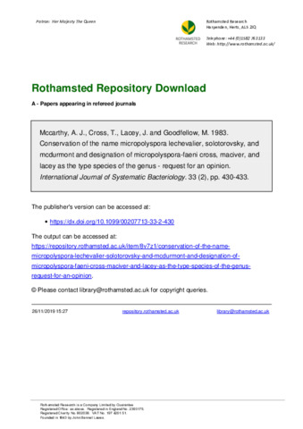 | Additional information | Times Cited: 4 Mccarthy, aj cross, t lacey, j goodfellow, m 4 Amer soc microbiology Washington UNIV BRADFORD,SCH BIOL SCI,BRADFORD BD7 1DP,W YORKSHIRE,ENGLAND. ROTHAMSTED EXPTL STN,HARPENDEN AL5 2JQ,HERTS,ENGLAND. UNIV NEWCASTLE UPON TYNE,DEPT MICROBIOL,NEWCASTLE TYNE NE1 7RU,TYNE & WEAR,ENGLAND. |