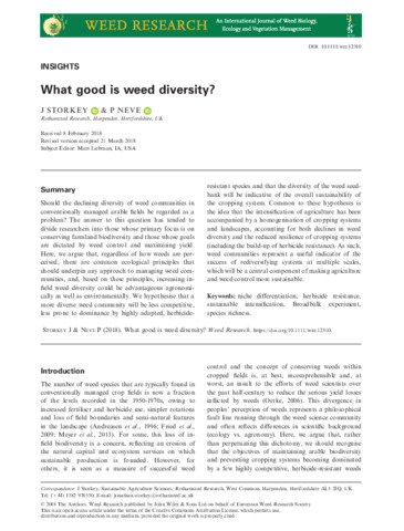 Should the declining diversity of weed communities in conventionally managed arable fields be regarded as a problem? The answer to this question has tended to divide researchers into those whose primary focus is on conserving farmland biodiversity and those whose goals are dictated by weed control and maximising yield. Here, we argue that, regardless of how weeds are perceived, there are common ecological principles that should underpin any approach to managing weed communities, and, based on these principles, increasing in‐field weed diversity could be advantageous agronomically as well as environmentally. We hypothesise that a more diverse weed community will be less competitive, less prone to dominance by highly adapted, herbicide‐resistant species and that the diversity of the weed seedbank will be indicative of the overall sustainability of the cropping system. Common to these hypotheses is the idea that the intensification of agriculture has been accompanied by a homogenisation of cropping systems and landscapes, accounting for both declines in weed diversity and the reduced resilience of cropping systems (including the build‐up of herbicide resistance). As such, weed communities represent a useful indicator of the success of rediversifying systems at multiple scales, which will be a central component of making agriculture and weed control more sustainable.