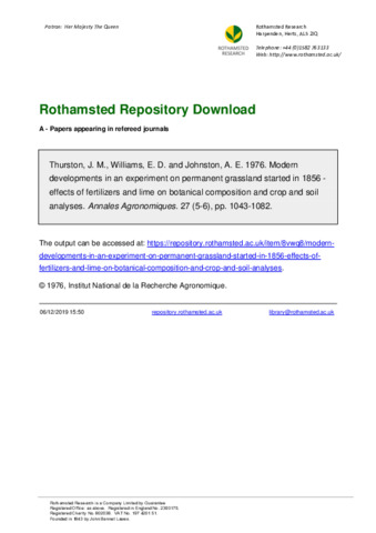 Modern developments in an experiment on permanent grassland started in 1856 - effects of fertilizers and lime on botanical composition and crop and soil analyses.