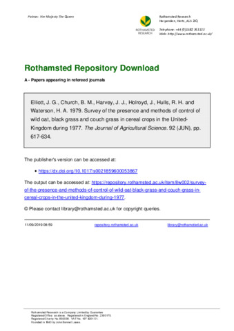 | Additional information | Times Cited: 9 Elliott, jg church, bm harvey, jj holroyd, j hulls, rh waterson, ha 9 Cambridge univ press New york ROTHAMSTED EXPTL STN,HARPENDEN AL5 2JQ,HERTFORDSHIRE,ENGLAND. AGR DEV & ADVISORY SERV,EXTENS DEV UNIT,READING RG1 6DT,ENGLAND. W SCOTLAND AGR COLL,ADVISORY & DEV SERV,AUCHINCRUIVE KA6 5HW,AYRSHIRE,SCOTLAND. ELLIOTT, JG (reprint author), ARC,WEED RES ORG,OXFORD OX5 1PF,ENGLAND. |