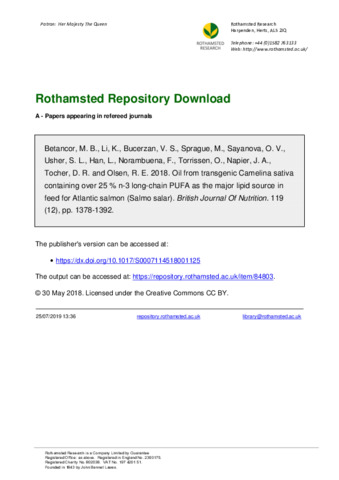 Oil from transgenic Camelina sativa containing over 25 % n-3 long-chain PUFA as the major lipid source in feed for Atlantic salmon (Salmo salar)
