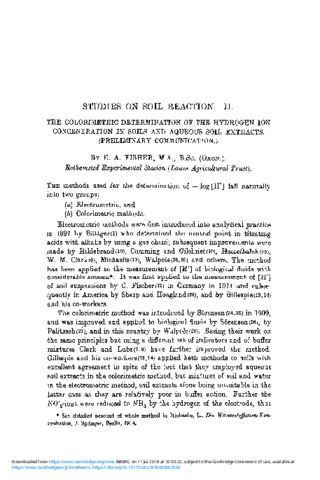 Studies on soil reaction. II. The colorimetric determination of the hydrogen ion concentration in soils and aqueous soil extracts.