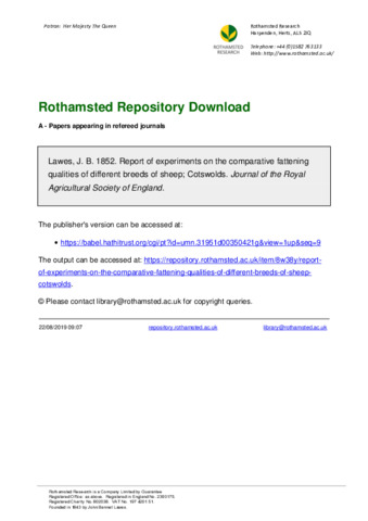 Lawes, John Bennet (1852) Report of experiments on the comparative fattening qualities of different breeds of sheep Part 2 Cotswolds. Journal of the Royal Agricultural Society of England, 13(1) (series). pp. 1-21.