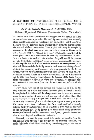 In cases of field experiments when one plot is missing, a method has been developed for furnishing an estimate of the yield of the missing plot, based on all the other values. The calculation is given for (a) a Randomised Block experiment, and (b) a Latin Square arrangement. In both cases the actual arithmetic is very simple.The steps in the procedure are:(1) Determine the desired value by an application of the equation (A) or (B) according as the experiment was arranged in Randomised Blocks or in a Latin Square.(2) Proceed as usual with the analysis of variance, using the estimated figure for the missing yield, and remembering to deduct one from the number of degrees of freedom ascribable to error.