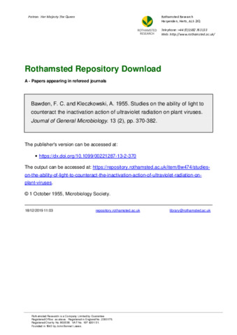 Summary: Of seven plant viruses tested, all except tobacco mosaic showed the phenomenon of photoreactivation, i.e. plants exposed to visible light after inoculation with preparations partially inactivated by ultraviolet radiation produced more local lesions than plants kept in darkness. Five strains of tobacco mosaic virus, which differed widely in their pathogenicity and other properties, were tested, but none showed the phenomenon. Of the six viruses that did, potato × showed it much the most strongly, tomato bushy stunt and a tobacco necrosis virus the least; cabbage black ringspot, cucumber mosaic and tobacco ringspot were intermediate.