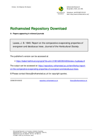 Lawes, John Bennet (1849) Report on the comparative evaporating properties of evergreen and deciduous trees.