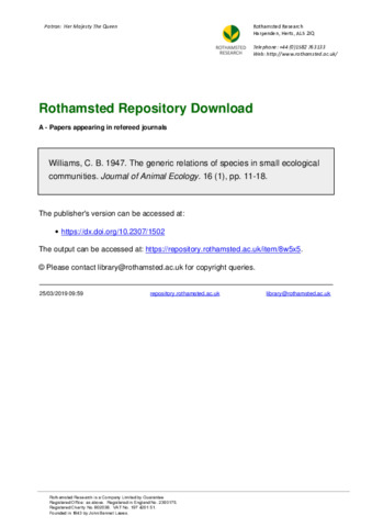 1. Evidence of conditions being more favourable or less favourable to species of the same genus, as compared with species on different genera (intrageneric versus inter-generic competition), can be found in the relative number of species and genera in small and in large natural communities of animals or plants. 2. It is, however, insufficient to show that the average number of species per genus is smaller in the smaller communities than in the larger as this is a mathematical result of taking a smaller sample from a larger group. It is necessary to show that the proportion of genera to species in the smaller communities is smaller or larger than would have been expected in a randomized sample of the same number of species, selected without reference to generic relationships from the larger fauna or flora. 3. Evidence had previously been brought forward to show that in large groups of animals or plants the number of genera with 1, 2, and with 3 and more species are closely represented by the mathematical `logarithmic series'. New evidence is here given to show that the same order exists in the genera and species of quite small ecological communities. 4. The logarithmic series has several mathematical properties of biological interest, including the possibility of calculating, for any population or sample, a factor known as the `Index of Diversity' which is common to all random samples from a single population. It is a measure of the extent to which the species are grouped into genera, and it is independent of the size of the sample. If the Index of Diversity is high, there are many genera in relation to the number of species; if the Index is low, there are fewer genera in relation to the number of species. 5. It thus becomes possible to compare the Index of Diversity in natural small or simple ecological communities, with that of the larger population from which these have been selected by nature. This has been done for a number of cases, including both animal and plant communities, and in every case from which significant results can be obtained the Index of Diversity in the small community is smaller than that of the larger fauna or flora. 6. The result therefore indicates that there are fewer genera in a small or simple community than would be expected in a sample of the same number of species selected at random--that is, independent of genera relationships--from the larger series. In other words, the evidence brought forward by this method indicates a selection by nature in favour of more than one species in the same genus rather than in favour of single species in different genera.