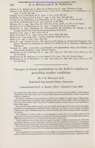 An attempt has been made to measure changes in a mixed insect population under natural conditions in the field, and to see to what extent they are quantitatively related to previous weather conditions. To obtain a measure of the population, insects were caught in a light-trap at Harpenden, about 25 miles north of London, every night for four years from 1933 to 1937, and again for four years from 1946 to 1950. In all about 1,440,000 insects, mostly Diptera, were captured on about 2850 nights. The measure of population level in any one month was the geometric mean catch per night, obtained by calculating the arithmetic mean of log (n + 1), where n is the number of insects caught in one night. This figure has to be corrected for the effect of prevailing weather conditions on activity. The departure of each month, on the logarithmic scale, from the average value for all repetitions of the same month gives a measure of how the population in this particular month is differing from the level to be expected for that time of the year. These departures were then made the basis of six-factor multiple regressions, in which the population change was the dependent variable, and the rainfall and minimum temperature departures from normal in each of the three preceding months were the independent variables. It is shown that a very high proportion of the mean changes of the population in the field can be accounted for by the effect of rainfall and minimum temperature in the three previous months. An examination of the regressions in the different seasons shows that rainfall has a high positive effect in the summer and autumn but little or no effect in the winter. Minimum temperature, on the contrary, has its lowest effect in the summer, so that the relation between population and minimum temperature one month previous is negative in the summer, and with temperature two months previous is negative in the autumn. The analysis of the available data has so far only been carried out on the total insect population, against rainfall and minimum temperature. Work is continuing on other weather conditions, other time intervals, and also on special groups of insects, but it is unlikely that the method can be applied with any great accuracy in the near future to single species of insects.