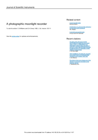 The paper describes a photographic recorder for moonlight. It consists of a cylindrical lens mounted on a light-tight drum which rotates at a speed of one revolution in 24 hours and 50 min., which is the average time of the moon's apparent rotation round the earth. The axis of the drum is set pointing to the pole star and by means of a timing disk the drum is set each afternoon so that the lens follows the position of the moon. Inside the rotating drum is a fixed drum on the outer surface of which is a strip of photographic bromide paper. On this the line image of the moon, produced by the cylindrical lens, is focused. The darkening of the bromide paper gives an indication both of the duration and of the intensity of the moonlight.