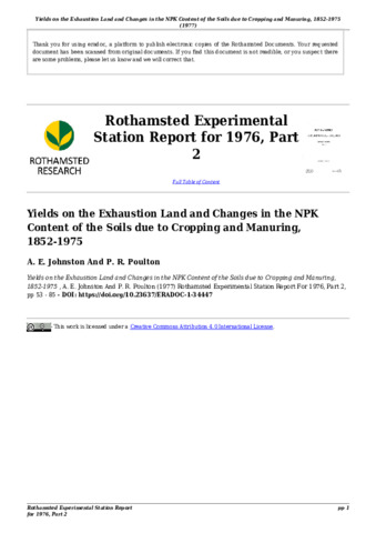 Yields on the Exhaustion Land and changes in NPK content of the soils due to cropping and manuring, 1852-1975.