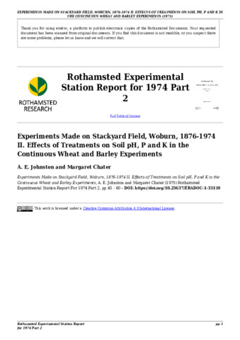 Experiments made on Stackyard Field, Woburn, 1876-1974. II. Effects of treatments on soil pH, P and K in the Continuous Wheat and Barley Experiments.
