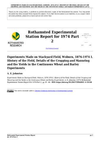 Experiments made on Stackyard Field, Woburn, 1876-1974. I. History of the Field, Details of the Cropping and Manuring and the Yields in the Continuous Wheat and Barley Experiments.