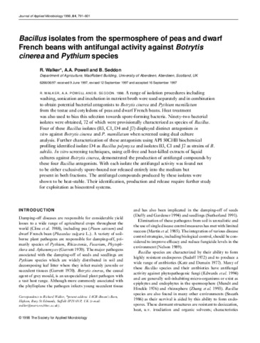 A range of isolation procedures including washing, sonication and incubation in nutrient broth were used separately and in combination to obtain potential bacterial antagonists to Botrytis cinerea and Pythium mamillatum from the testae and cotyledons of peas and dwarf French beans. Heat treatment was also used to bias this selection towards spore-forming bacteria. Ninety-two bacterial isolates were obtained, 72 of which were provisionally characterized as species of Bacillus. Four of these Bacillus isolates (B3, C1, D4 and J7) displayed distinct antagonism in vitro against Botrytis cinerea and P. mamillatum when screened using dual culture analysis. Further characterization of these antagonists using API 50CHB biochemical profiling identified isolate D4 as Bacillus polymyxa and isolates B3, C1 and J7 as strains of B. subtilis. rn vitro screening techniques, using cell-free and heat-killed extracts of liquid cultures against Botrytis cinerea, demonstrated the production of antifungal compounds by these four Bacillus antagonists. With each isolate the antifungal activity was found not to be either exclusively spore-bound nor released entirely into the medium but present in both fractions. The antifungal compounds produced by these isolates were shown to be heat-stable. Their identification, production and release require further study for exploitation as biocontrol systems.