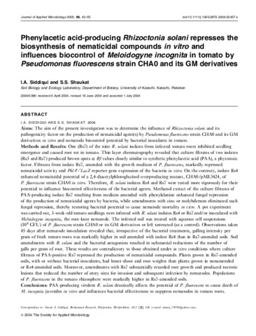 Aims: The aim of the present investigation was to determine the influence of Rhizoctonia solani and its pathogenicity factor on the production of nematicidal agent(s) by Pseudomonas fluorescens strain CHA0 and its GM derivatives in vitro and nematode biocontrol potential by bacterial inoculants in tomato. Methods and Results: One (Rs7) of the nine R. solani isolates from infected tomato roots inhibited seedling emergence and caused root rot in tomato. Thin layer chromatography revealed that culture filtrates of two isolates (Rs3 and Rs7) produced brown spots at Rf-values closely similar to synthetic phenylacetic acid (PAA), a phytotoxic factor. Filtrates from isolate Rs7, amended with the growth medium of P. fluorescens, markedly repressed nematicidal activity and PhlA'-'LacZ reporter gene expression of the bacteria in vitro. On the contrary, isolate Rs4 enhanced nematicidal potential of a 2,4-diacetylphloroglucinol overproducing mutant, CHA0/pME3424, of P. fluorescens strain CHA0 in vitro. Therefore, R. solani isolates Rs4 and Rs7 were tested more rigorously for their potential to influence biocontrol effectiveness of the bacterial agents. Methanol extract of the culture filtrates of PAA-producing isolate Rs7 resulting from medium amended with phenylalanine enhanced fungal repression of the production of nematicidal agents by bacteria, while amendments with zinc or molybdenum eliminated such fungal repression, thereby restoring bacterial potential to cause nematode mortality in vitro. A pot experiment was carried out, 3-week-old tomato seedlings were infested with R. solani isolates Rs4 or Rs7 and/or inoculated with Meloidogyne incognita, the root-knot nematode. The infested soil was treated with aqueous cell suspensions (10(8) CFU) of P. fluorescens strain CHA0 or its GM derivatives or left untreated (as a control). Observations taken 45 days after nematode inoculation revealed that, irrespective of the bacterial treatments, galling intensity per gram of fresh tomato roots was markedly higher in soil amended with isolate Rs4 than in Rs7-amended soils. Soil amendments with R. solani and the bacterial antagonists resulted in substantial reductions of the number of galls per gram of root. These results are contradictory to those obtained under in vitro conditions where culture filtrates of PAA-positive Rs7 repressed the production of nematicidal compounds. Plants grown in Rs7-amended soils, with or without bacterial inoculants, had lesser shoot and root weights than plants grown in nonamended or Rs4-amended soils. Moreover, amendments with Rs7 substantially retarded root growth and produced necrotic lesions that reduced the number of entry sites for invasion and subsequent infection by nematodes. Populations of P. fluorescens in the tomato rhizosphere were markedly higher in Rs7-amended soils. Conclusions: PAA-producing virulent R. solani drastically affects the potential of P. fluorescens to cause death of M. incognita juveniles in vitro and influences bacterial effectiveness to suppress nematodes in tomato roots. Significance and Impact of the Study: As most agricultural soils are infested with root-infecting fungi, including R. solani, it is likely that some PAA-producing isolates of the fungus may also be isolated from such soils. The inhibitory effect of PAA-producing R. solani on the biosynthesis of nematicidal agent(s) critical in biocontrol may reduce or even eliminate the effectiveness of fluorescent pseudomonads against root-knot nematodes, both in nursery beds and in field conditions. Introduction of bacterial inoculants, for the control of any plant pathogen, should be avoided in soils infested with PAA-producing R. solani. Alternatively, the agents could be applied together with an appropriate quantity of fungicide or chemicals such as zinc to create an environment more favourable for bacterial biocontrol action.