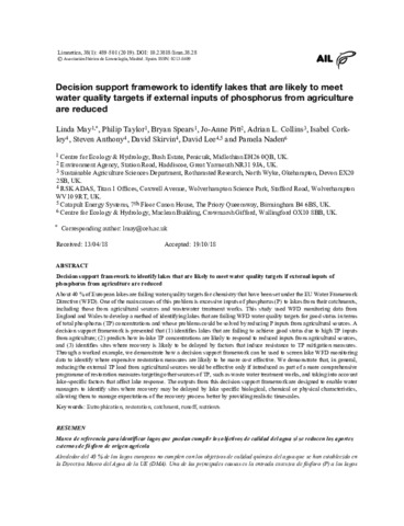 About 40 % of European lakes are failing water quality targets for chemistry that have been set under the EU Water Framework Directive (WFD). One of the main causes of this problem is excessive inputs of phosphorus (P) to lakes from their catchments,including those from agricultural sources and wastewater treatment works. This study used WFD monitoring data from England and Wales to develop a method of identifying lakes that are failing WFD water quality targets for good status in terms of total phosphorus (TP) concentrations and whose problems could be solved by reducing P inputs from agricultural sources. A decision support framework is presented that (1) identifies lakes that are failing to achieve good status due to high TP inputs from agriculture; (2) predicts how in-lake TP concentrations are likely to respond to reduced inputs from agricultural sources, and (3) identifies sites where recovery is likely to be delayed by factors that induce resistance to TP mitigation measures. Through a worked example, we demonstrate how a decision support framework can be used to screen lake WFD monitoring data to identify where expensive restoration measures are likely to be more cost effective. We demonstrate that, in general, reducing the external TP load from agricultural sources would be effective only if introduced as part of a more comprehensive programme of restoration measures targeting other sources of TP, such as waste water treatment works, and taking into account lake-specific factors that affect lake response. The outputs from this decision support framework are designed to enable water managers to identify sites where recovery may be delayed by lake specific biological, chemical or physical characteristics, allowing them to manage expectations of the recovery process better by providing realistic timescales.