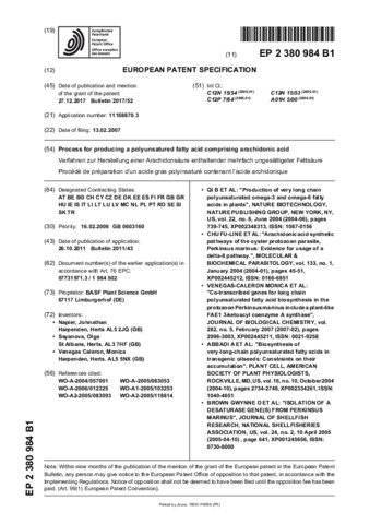 Process For Producing A Polyunsatured Fatty Acid Comprising Arachidonic Acid (Patent EP 2380984 B1).
