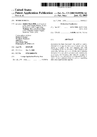| Additional information | Owners Plant Bioscience Ltd (Sept 03 2003) Rothamsted Research Limited (Jul 25 2003) Btg International Limited (Jul 24 2002) Document History Publication: Jun 12, 2003 US 2003/0109586 A1 Application: Oct 15, 2002 US 14920002 A Priority: Dec 11, 2000 GB 0004733 W Priority: Jan 7, 2000 GB 0000329 A Priority: Dec 10, 1999 GB 9929309 A |