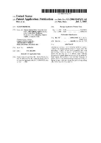 | Additional information | Owners (US) Plant Bioscience Limited (Sep 03 2003) Rothamsted Research Limited (Jul 25 2003) Btg International Limited (Jul 24 2002) Document History Publication: Jul 7, 2005 US 2005/0147635 A1 Application: Nov 24, 2004 US 99674104 A Priority: Nov 24, 2004 US 99674104 A Priority: Oct 15, 2002 US 14920002 A Priority: Dec 11, 2000 GB 0004733 W Priority: Jan 7, 2000 GB 0000329 A Priority: Dec 10, 1999 GB 9929309 A |