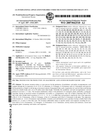 Process For The Production Of Arachidonic Acid And/or Eicosapentaenoic Acid (Patent WO 2007/042510 A2)