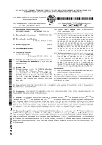Method For The Production Of ?-linolenic Acid And/or Stearidonic Acid In Transgenic Brassicaceae And Linaceae (Patent WO 2007/051577 A2)