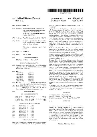 | Additional information | Owners Plant Bioscience Limited (Sep 03 2003) Rothamsted Research Limited (Jul 25 2003) Btg International Limited (Jul 24 2002) Document History Publication: Oct 26, 2010 US 7820153 B2 Application: Nov 24, 2004 US 99674104 A Priority: Nov 24, 2004 US 99674104 A Priority: Oct 15, 2002 US 14920002 A Priority: Dec 11, 2000 GB 0004733 W Priority: Jan 7, 2000 GB 0000329 A Priority: Dec 10, 1999 GB 9929309 A |