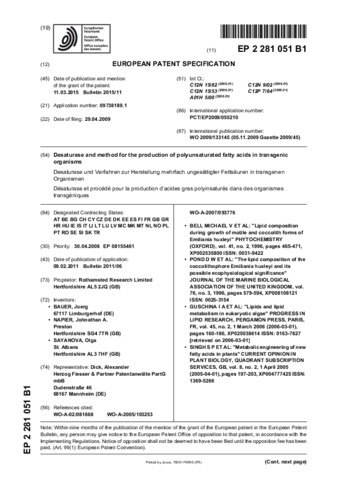 Desaturase And Method For The Production Of Polyunsaturated Fatty Acids In Transgenic Organisms (Patent EP 2281051 B1).