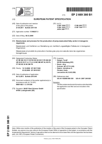 Desaturases And Process For The Production Of Polyunsaturated Fatty Acids In Transgenic Organisms (Patent EP 2669380 B1).