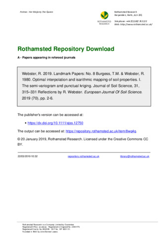 Landmark Papers: No. 8 Burgess, T.M. & Webster, R. 1980. Optimal interpolation and isarithmic mapping of soil properties. I. The semi-variogram and punctual kriging. Journal of Soil Science, 31, 315–331 Reflections by R. Webster.