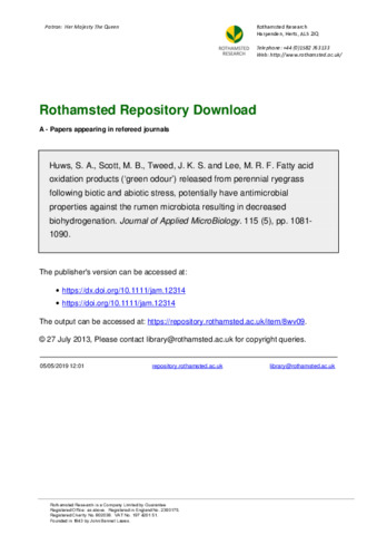 Fatty acid oxidation products (‘green odour’) released from perennial ryegrass following biotic and abiotic stress, potentially have antimicrobial properties against the rumen microbiota resulting in decreased biohydrogenation