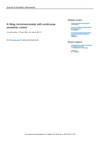 A null-reading liquid manometer is described in which the meniscus is returned to the reading position by varying the angle of slope. Sensitivity automatically decreases as the applied pressure increases; it is highest at zero readings and its absolute level can be continuously varied. A magnification factor can be employed by using different reading positions on the tube which is 0.1 in. bore, pivoted near the reservoir and tilted at its distal end by a standard micrometer-head, so keeping the construction simple and not critical. The prototype, which is wall-mounted, reads easily at air-speeds of 7.5 ft/s with a Pitot-static tube; the highest limits of accuracy assessed are ± 0.2 dyn/cm2, i.e. 6.5 ft/s ± 0.5%. The upper reading limit is about 0.7 in. w.g. (50 ft/s). RESP-3445