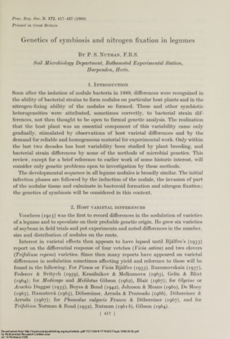 Soon after the isolation of nodule bacteria in 1888, differences were recognized in the ability of bacterial strains to form nodules on particular host plants and in the nitrogen-fixing ability of the nodules so formed. These and other symbiotic heterogeneities were attributed, sometimes correctly, to bacterial strain differences, not then thought to be open to formal genetic analysis. The realization that the host plant was an essential component of this variability came only gradually, stimulated by observations of host varietal differences and by the demand for reliable and homogeneous material for experimental work. Only within the last two decades has host variability been studied by plant breeding, and bacterial strain differences by some of the methods of microbial genetics. This review, except for a brief reference to earlier work of some historic interest, will consider only genetic problems open to investigation by these methods. The developmental sequence in all legume nodules is broadly similar. The initial infection phases are followed by the induction of the nodule, the invasion of part of the nodular tissue and culminate in bacteroid formation and nitrogen fixation; the genetics of symbiosis will be considered in this context. RESP-5942