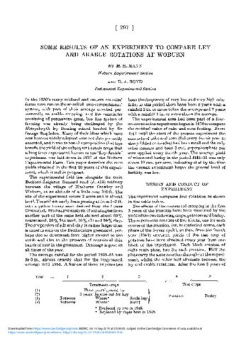 The effect of short leys and arable cropping on the yields of the following arable crops has been tested since 1937 at Woburn Experimental Farm, Bedfordshire. The leys were a 3-year grazed ley and 3 years of lucerne cut for hay and the arable cropping was potatoes, winter cereal and either a 1-year ley or a third tillage crop. The effects of these crop sequences were measured by test crops of potatoes and barley, uniformly treated except that 15 tons farmyard manure was applied on one-half of each plot for potatoes.