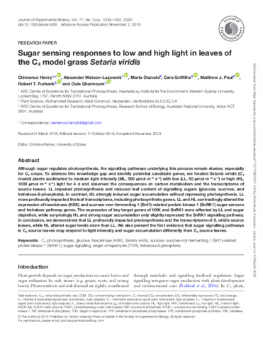 Sugar sensing responses to low and high light in leaves of the C4 model grass Setaria viridis