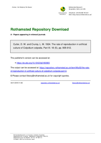 The rate of reproduction in artificial culture of Colpidium colpoda. Part III