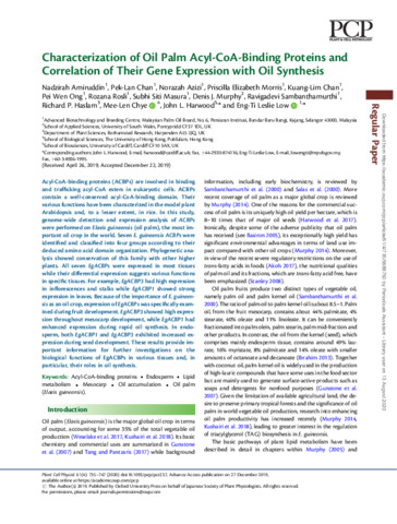 | Keywords | Acyl-CoA-binding proteins, Endosperm, Lipid metabolism, Mesocarp, Oil accumulation, Oil palm , Elaeis guineensis |