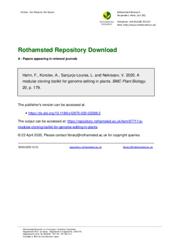 | Additional information | Supplementary information accompanies this paper at https://doi.org/10.1186/s12870-020-02388-2 Additional file 1: Supplementary methods and protocols. Figure S1. A timeline for assembly of a level 2 CRISPR/Cas construct. Table S1. A list of modules encoding guide RNA backbones with matching CRISPR/Cas nucleases and Pol III promoters. Table S2. Primer design for inserting guide sequences into respective guide RNA backbone modules. Table S3. Pol III promoter modules and matching position 1 modules in the tRNA-sgRNA array. Table S4. Primers used in this study. |