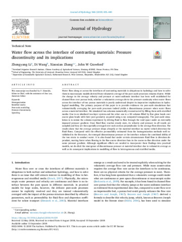 Water flow across the interface of contrasting materials: Pressure discontinuity and its implications
